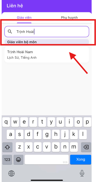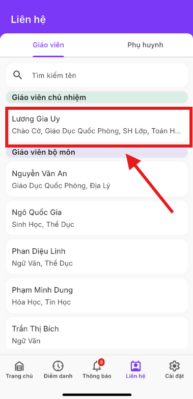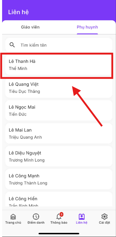 Chọn tên Giáo viên hoặc phụ huynh người dùng muốn tìm kiếm.