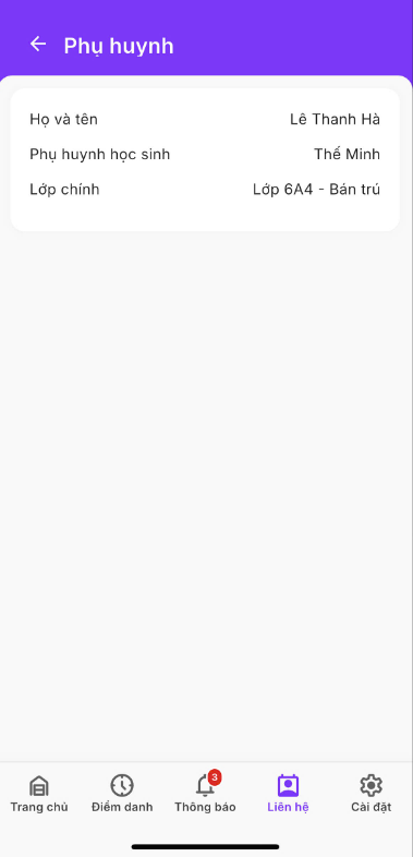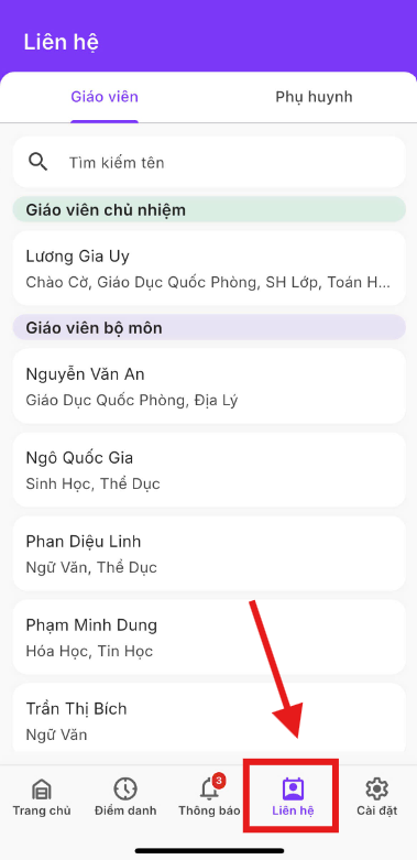 Tại thanh menu phía dưới màn hình, chọn mục Liên hệ để xem danh sách thông tin liên hệ của giáo viên và phụ huynh học sinh trong lớp.