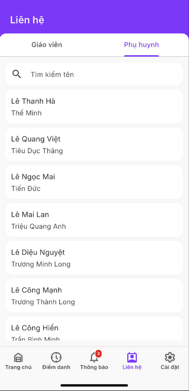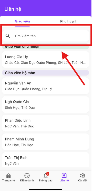 Người dùng có thể tìm nhanh giáo viên hoặc phụ huynh bằng cách: