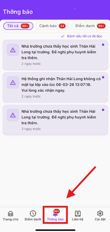 Điểm danh — Hiển thị các thông báo liên quan đến trạng thái điểm danh của học sinh trong các buổi học.