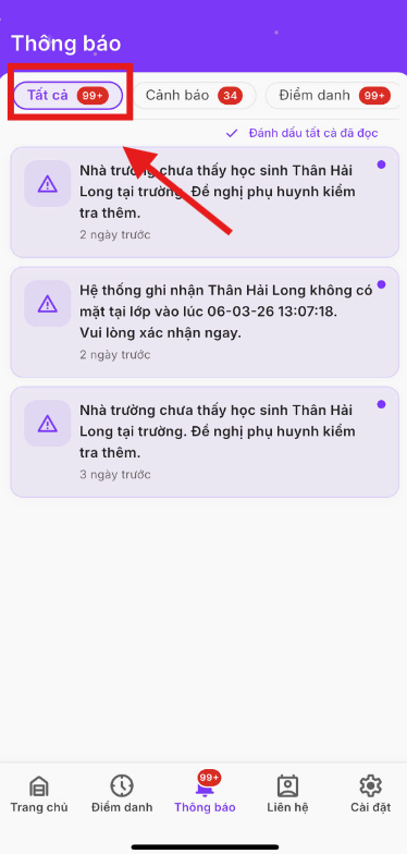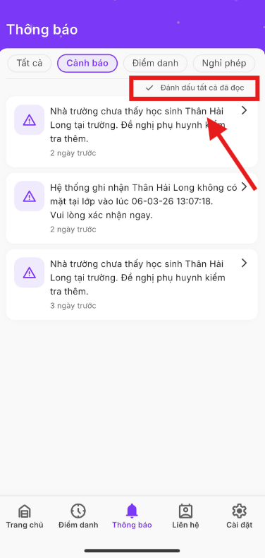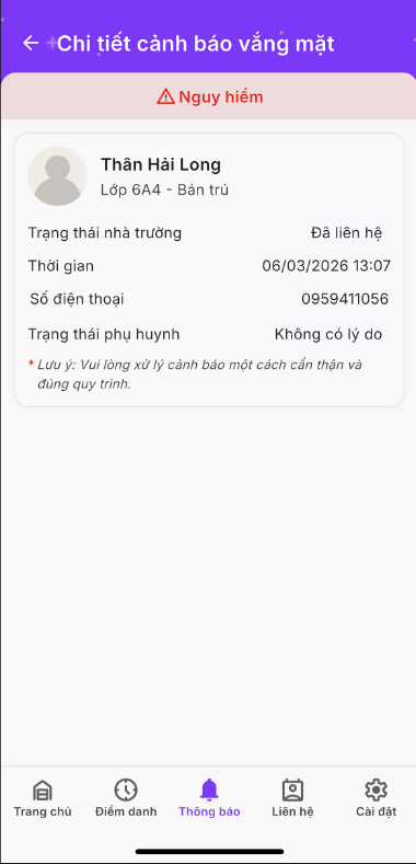 Cảnh báo — Hiển thị các thông báo liên quan đến cảnh báo như vắng mặt hoặc các trường hợp cần phụ huynh/học sinh chú ý.
