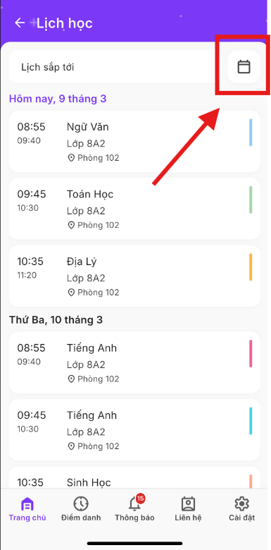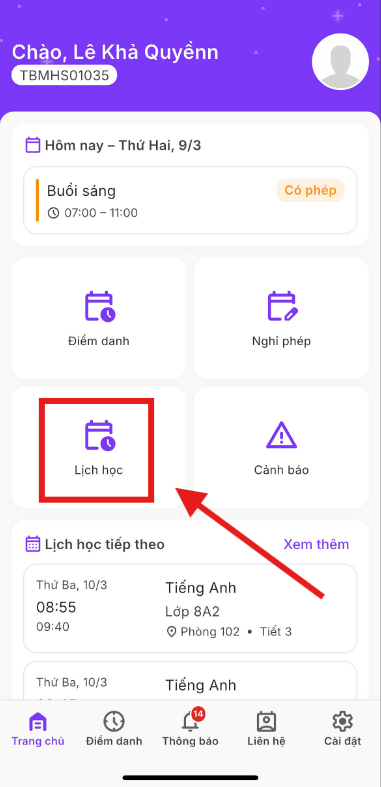 Tại màn hình trang chủ của ứng dụng, chọn Lịch học để mở màn hình thời khóa biểu.