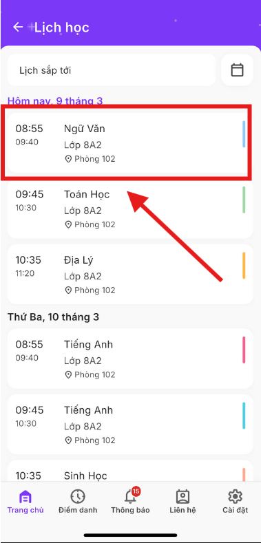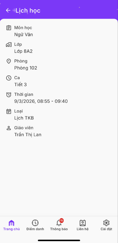 Nhấn vào một tiết học trong lịch để xem thông tin chi tiết, bao gồm: