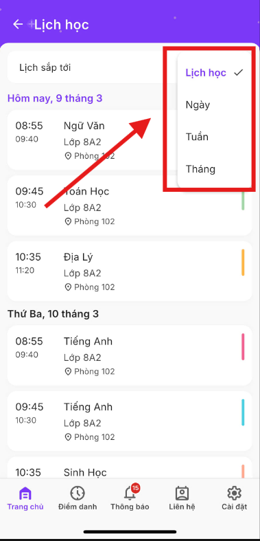 Tại góc trên bên phải màn hình, nhấn vào Lịch học để chọn chế độ xem: