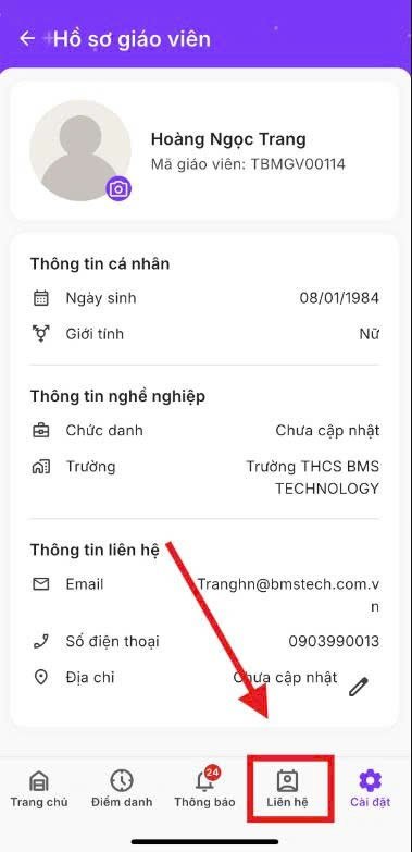 Truy cập chức năng Liên hệ để xem thông tin và liên hệ với:
