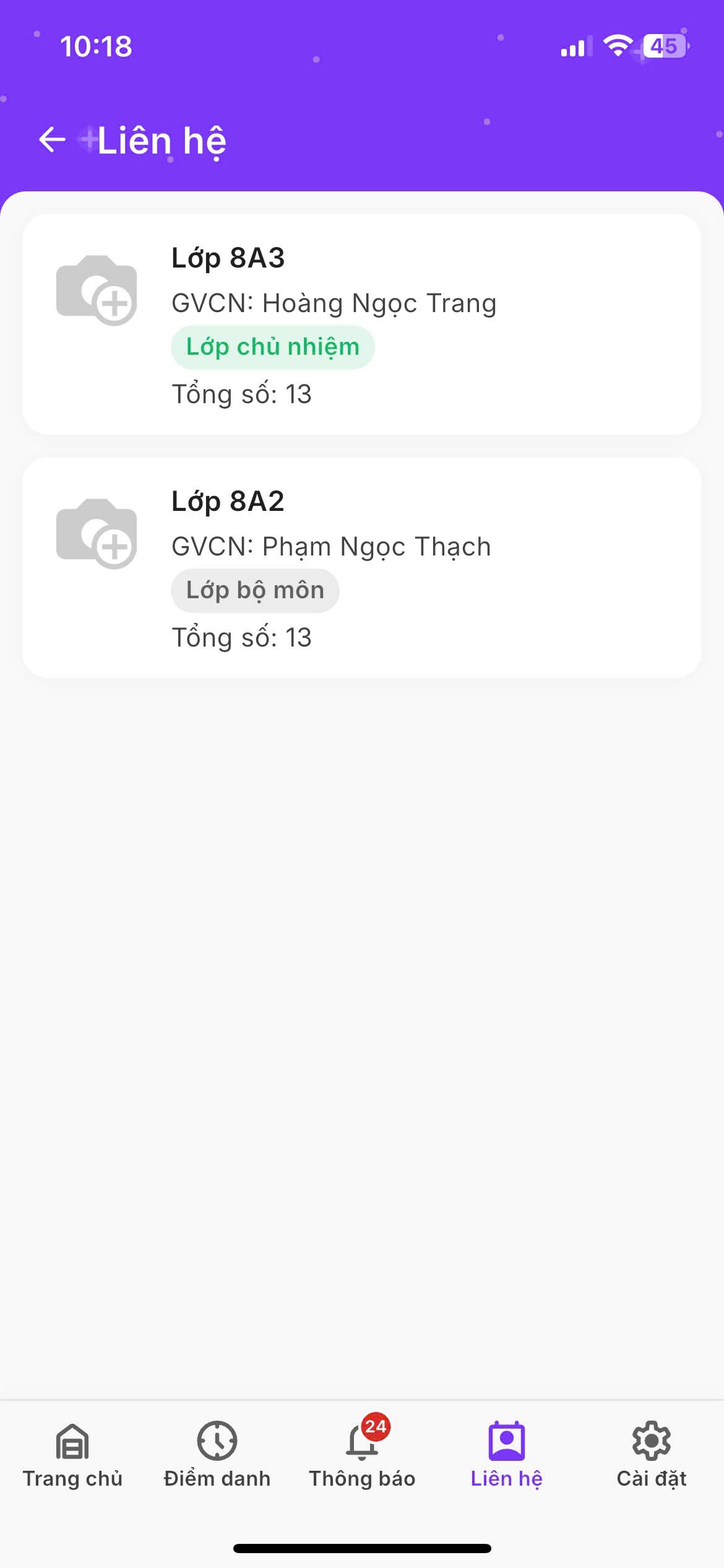 Chọn lớp cần xem thông tin liên hệ.