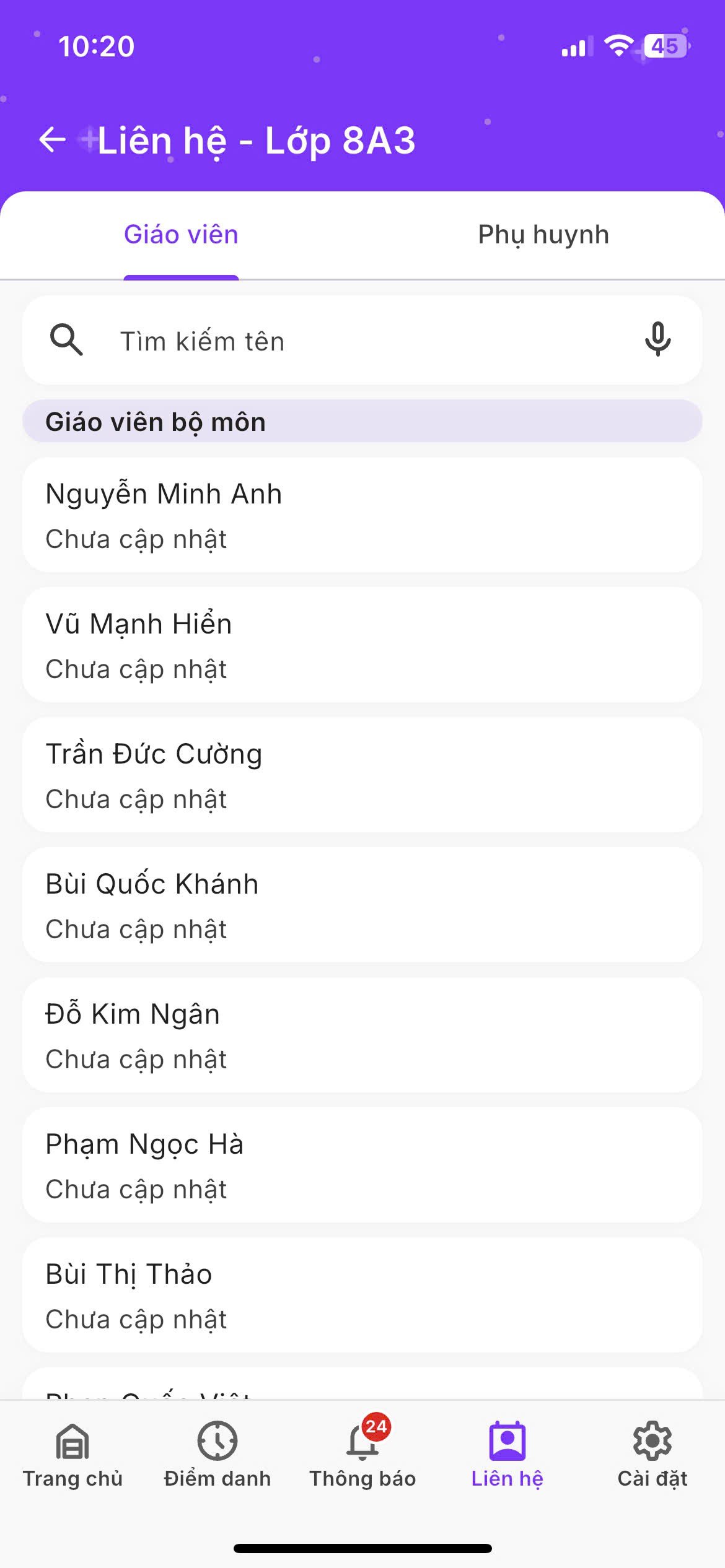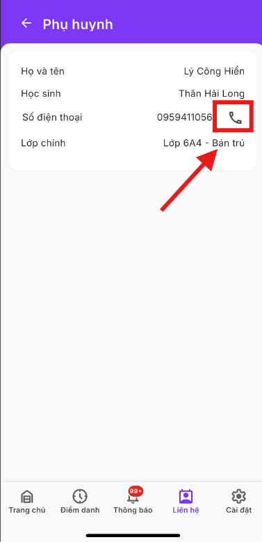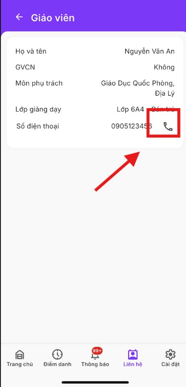 Chức năng này hỗ trợ giáo viên tìm kiếm thông tin liên hệ nhanh và thực hiện cuộc gọi trực tiếp khi cần trao đổi.