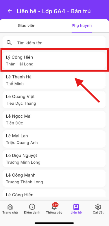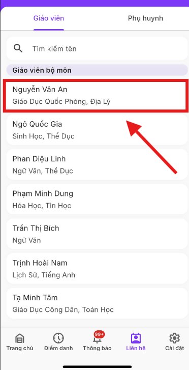 Chọn giáo viên hoặc phụ huynh cần liên hệ.