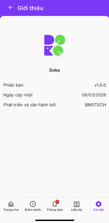 Tại màn hình Cài đặt, Chức năng Giới thiệu cung cấp thông tin về ứng dụng như phiên bản, nhà phát triển và các thông tin liên quan khác.