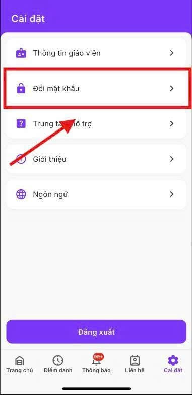 Tại màn hình Cài đặt, chọn mục Đổi mật khẩu để thay đổi mật khẩu đăng nhập.